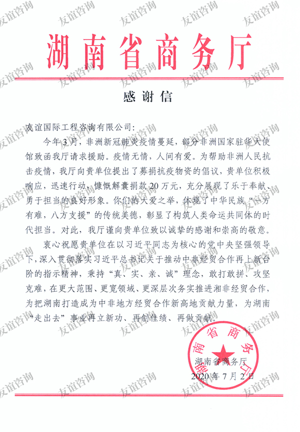 - 湖南省商務(wù)廳感謝信